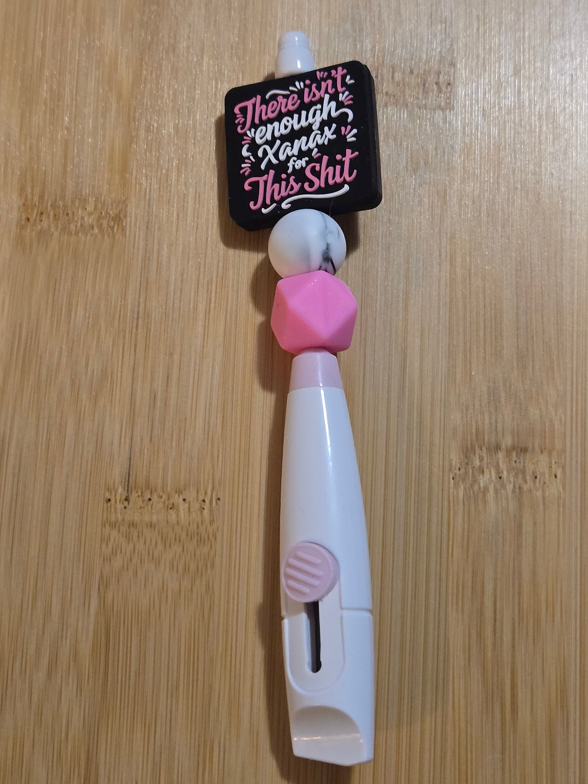 White box cutter with pink and white marble beads and a "There isn't......this shit" focal