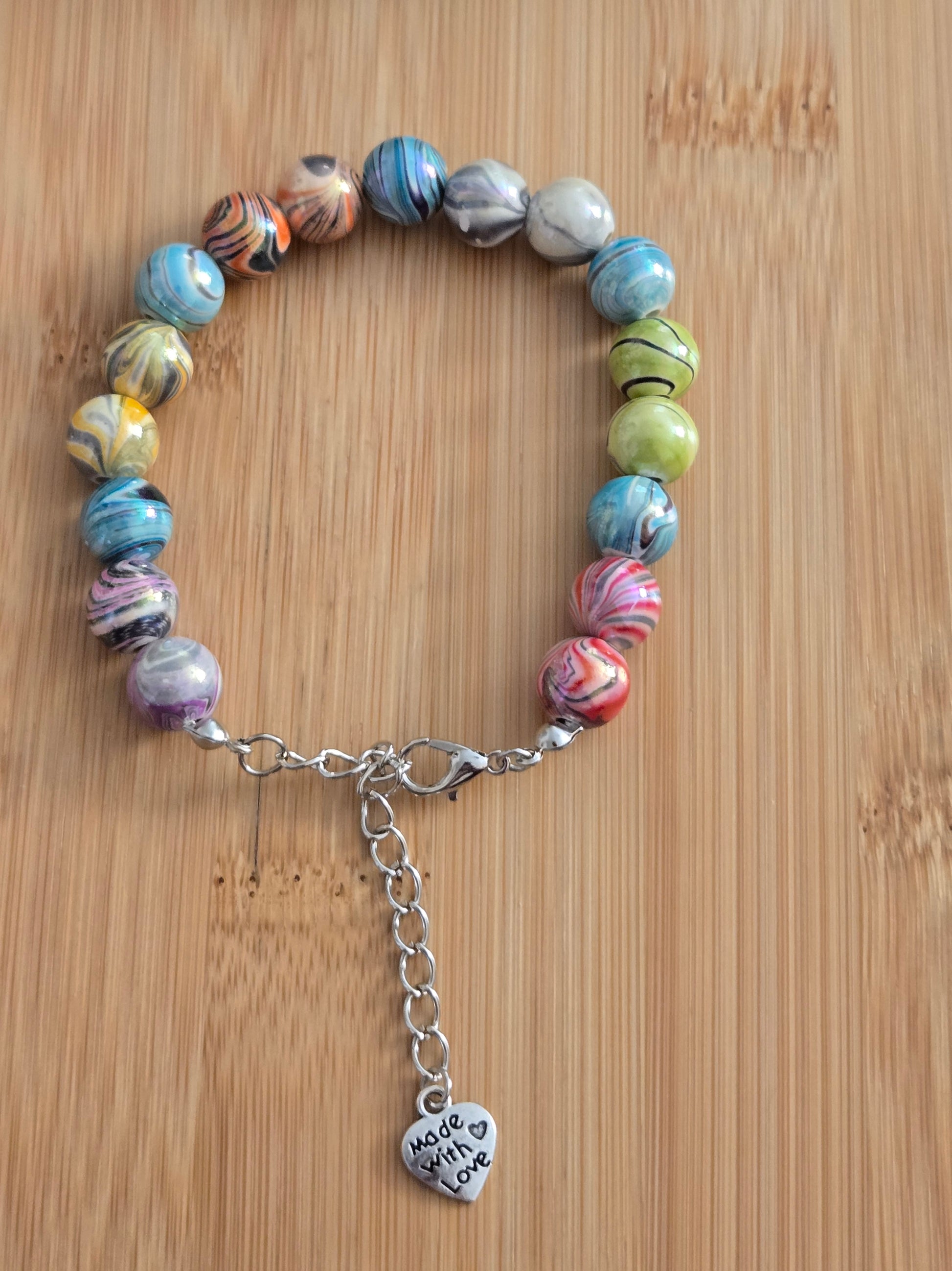 Pink, blue, red, green, gray, yellow, and orange marble beaded bracelet