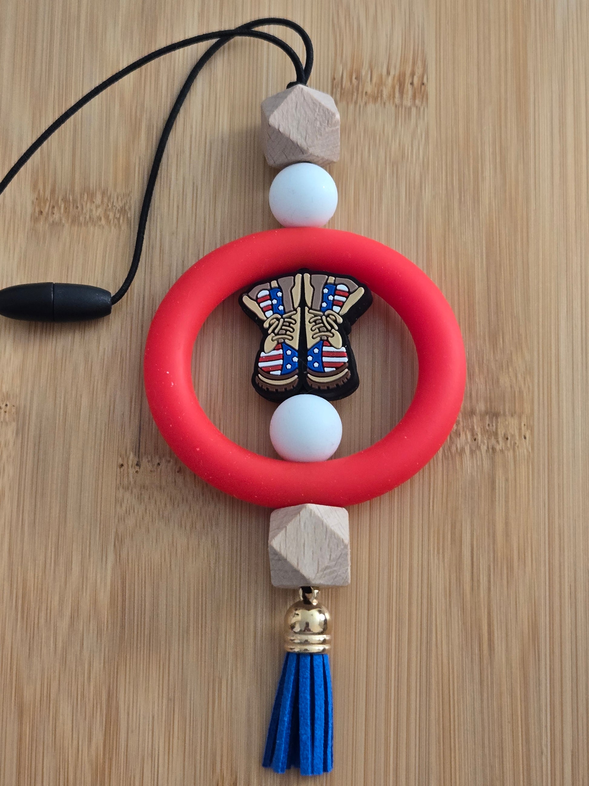 White and wooden beads with a red ring military boots and a blue tassel