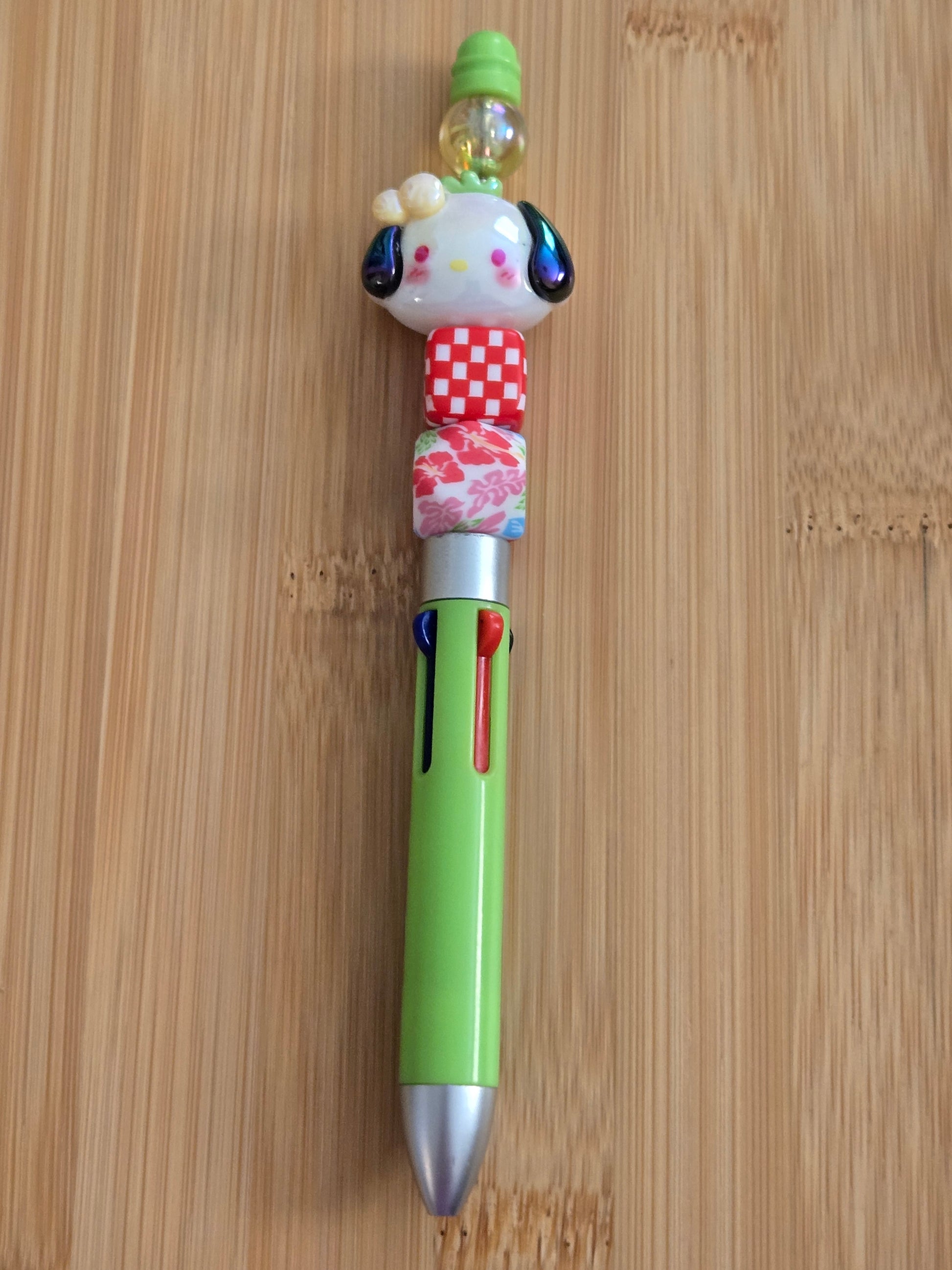 Green multicolored pen with green, a flower, a red cube, and Hello Kitty and friends beads
