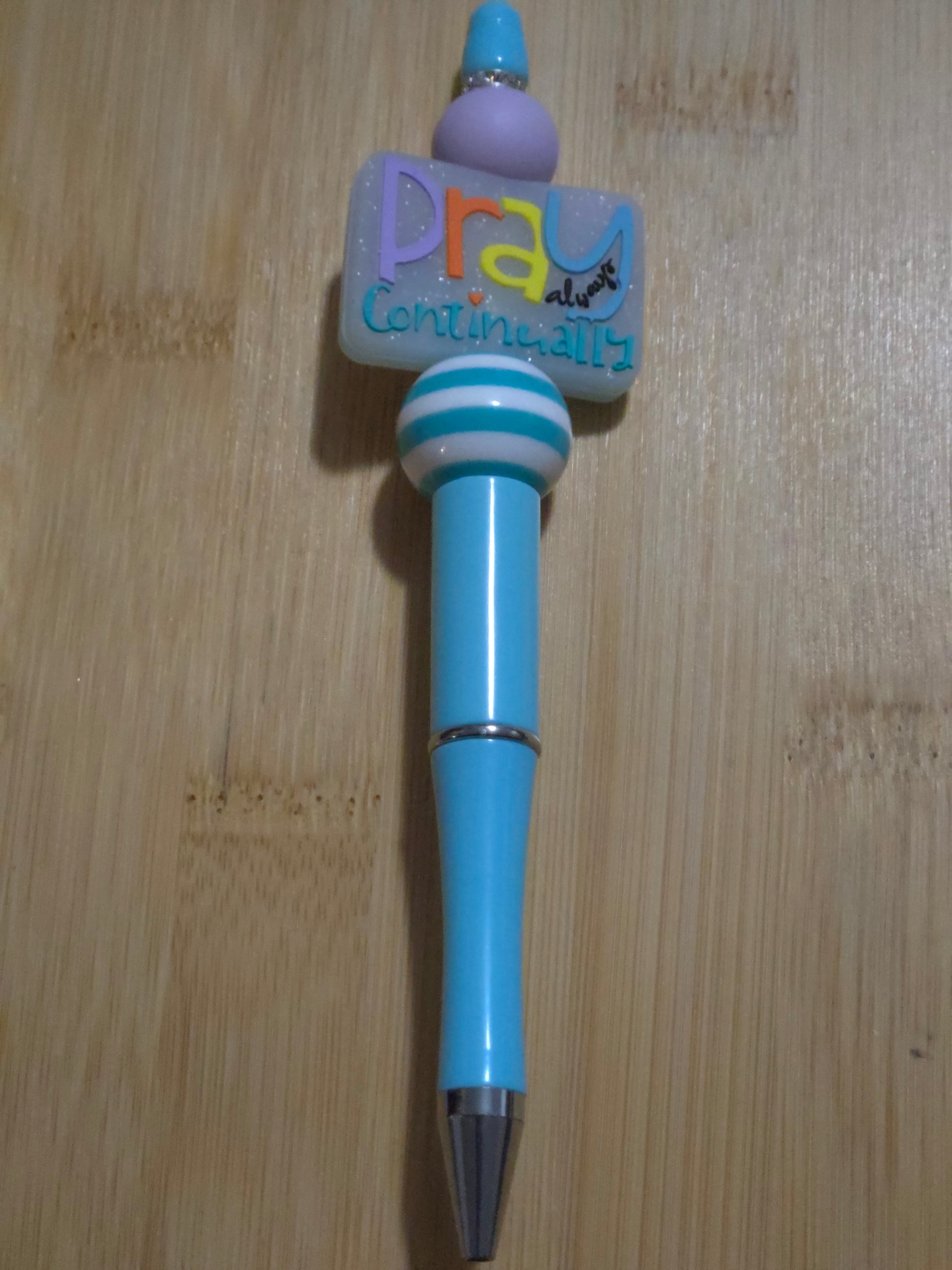 Light blue pen with purple and blue and white stripe beads and a "Pray" focal