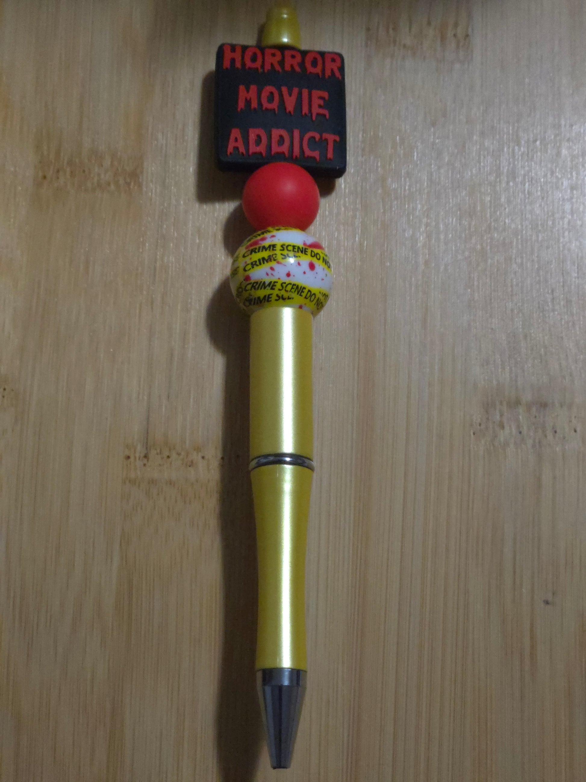 Gold pen with a crime and red bead and a "Horror" focal