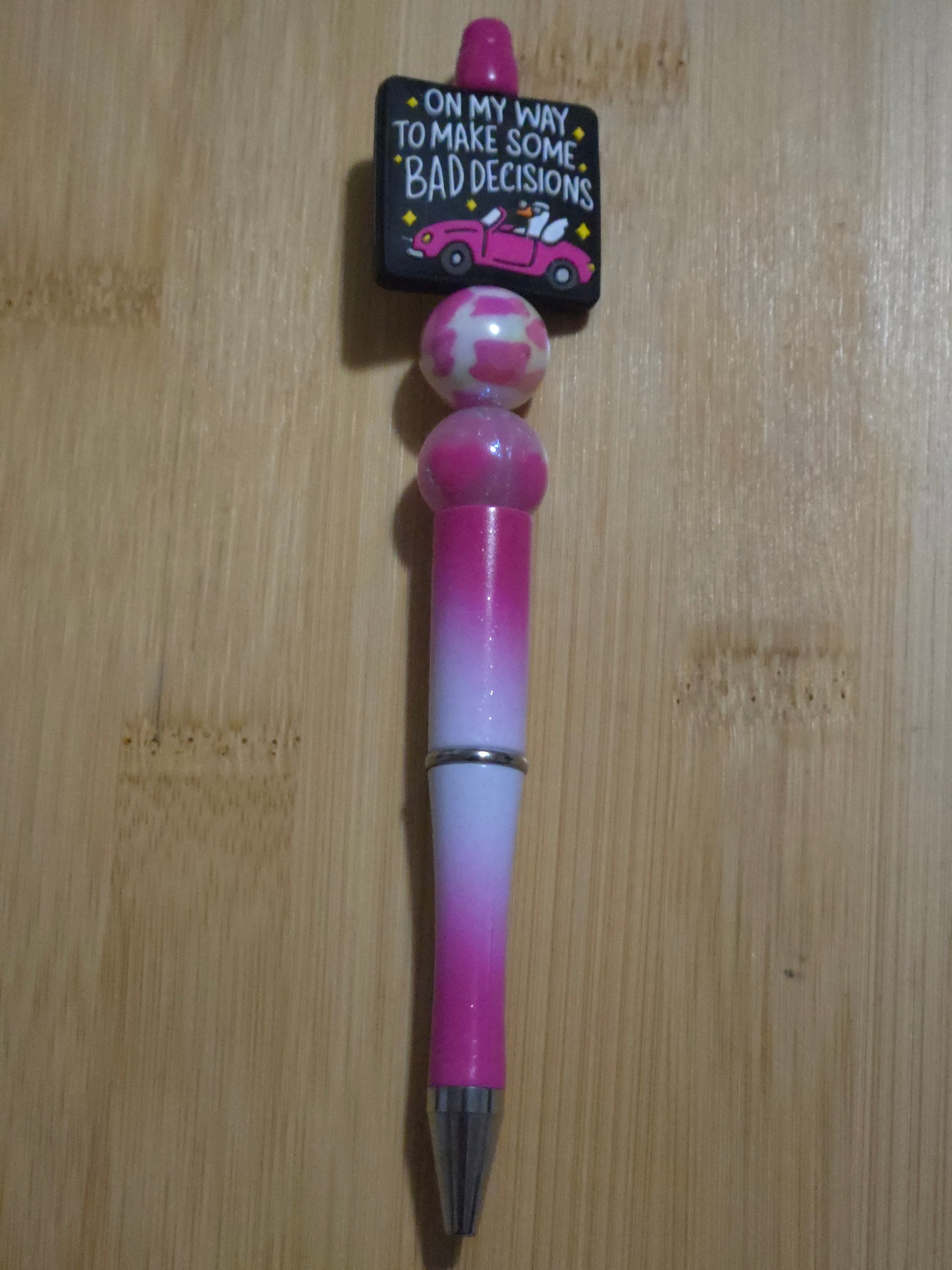 Pink ombre pen with a pink heart bead and a pink and white bead and a "Bad Decisions" focal