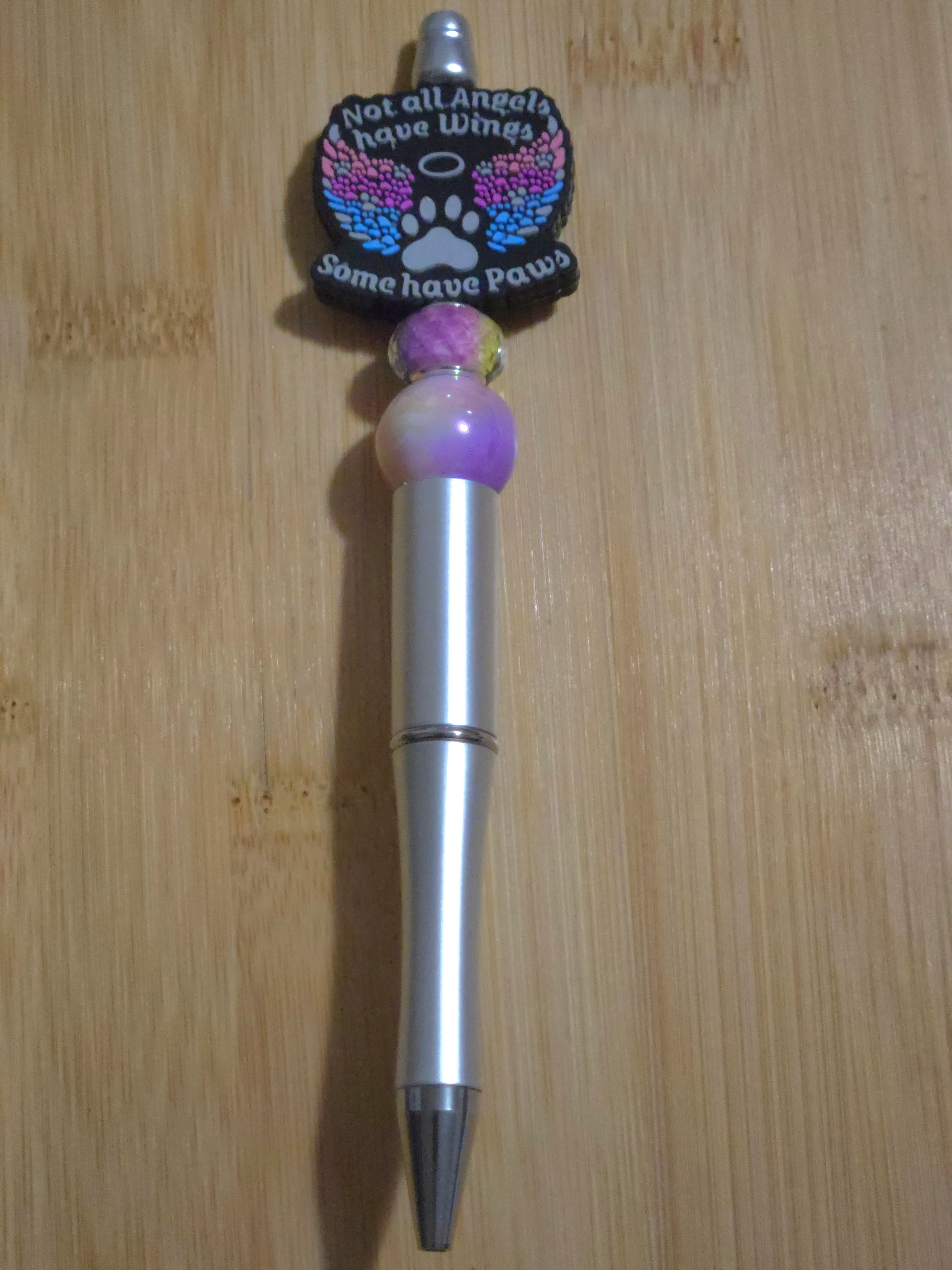Silver pen with iridescent beads and a "Not all Angels" focal