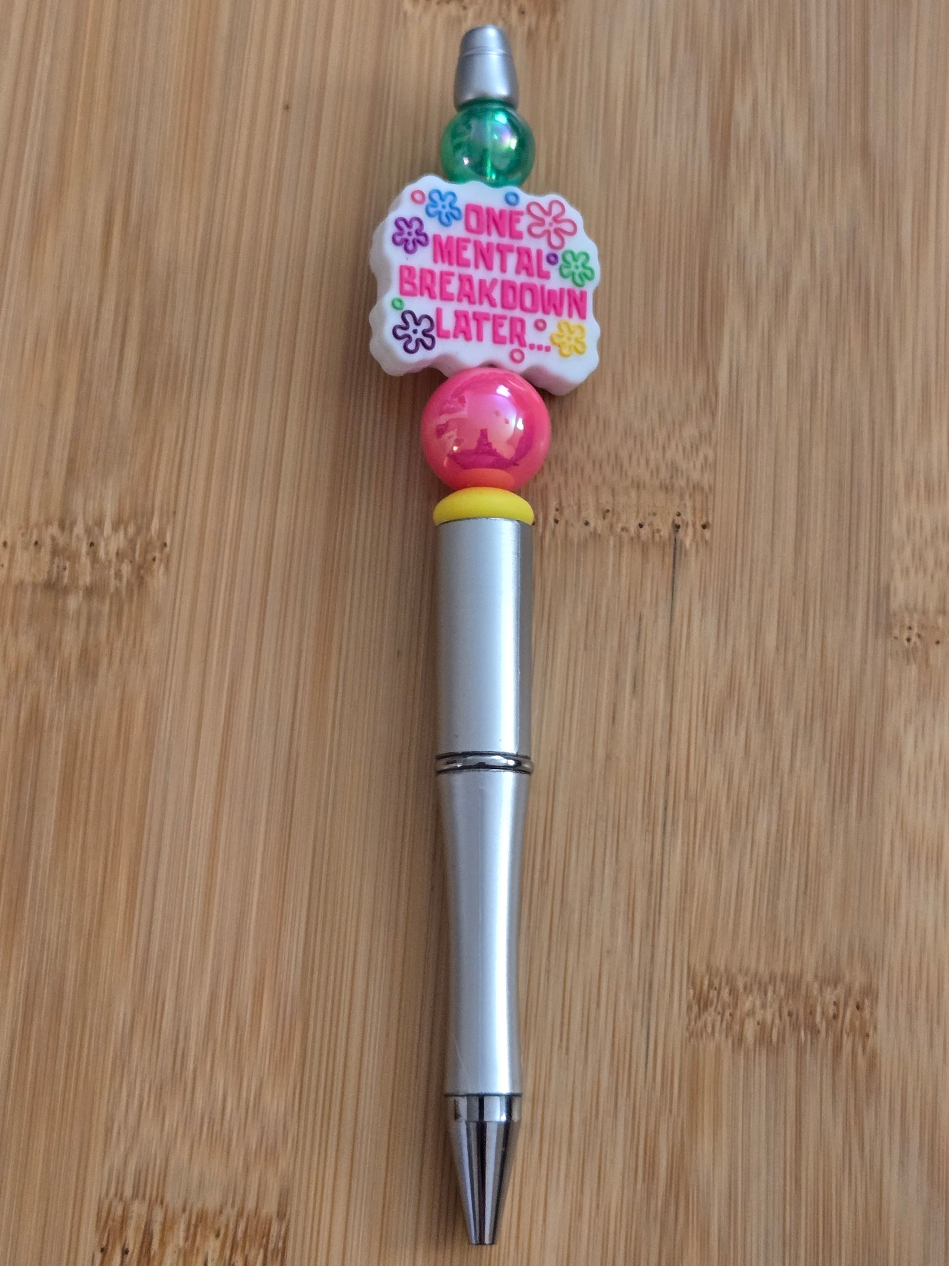 Silver pen with a bright pink and green beads with a "One Mental Breakdown Later" focal