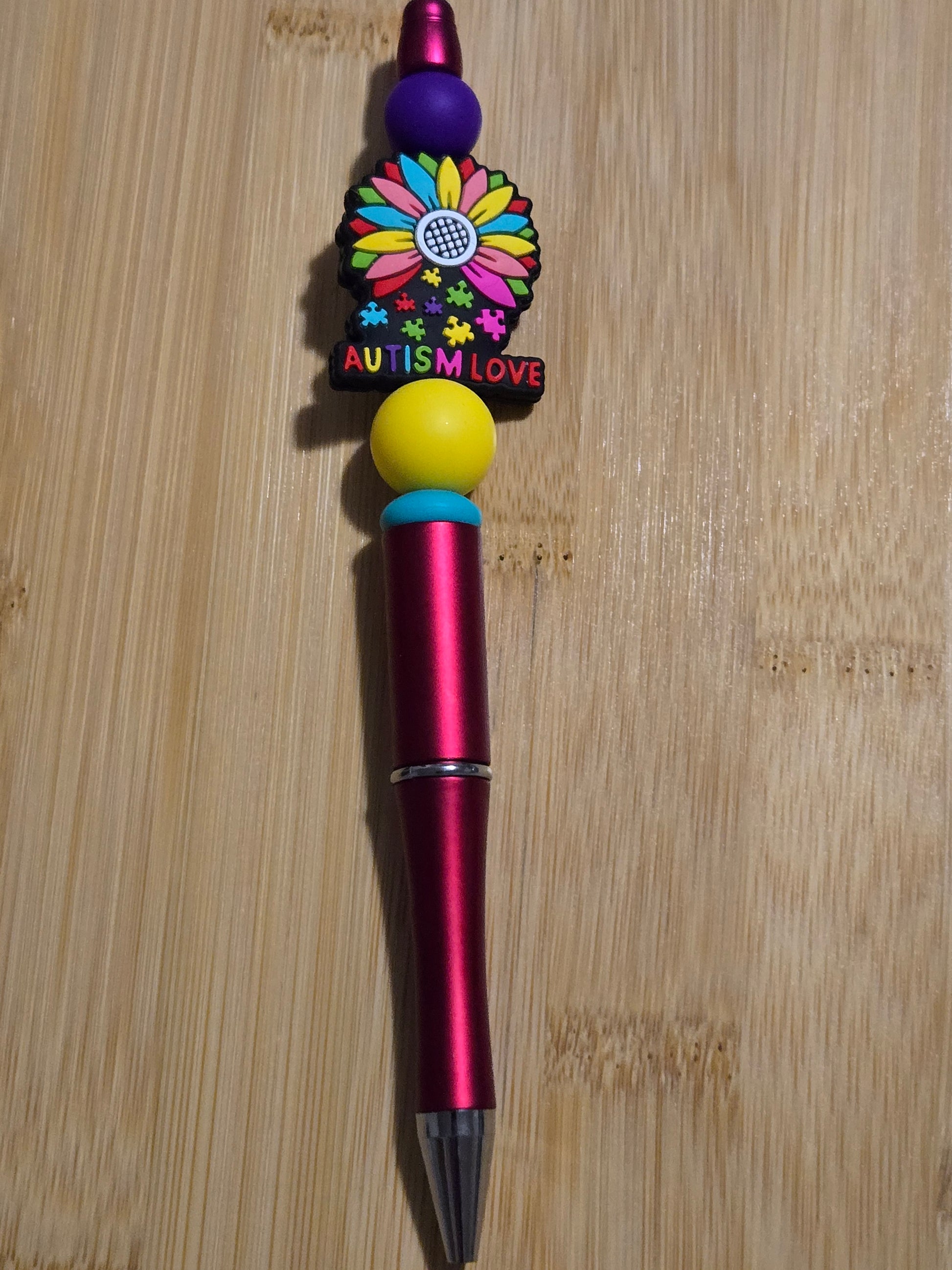 Red pen with purple, yellow, and teal beads and an "Autism Love" flower focal