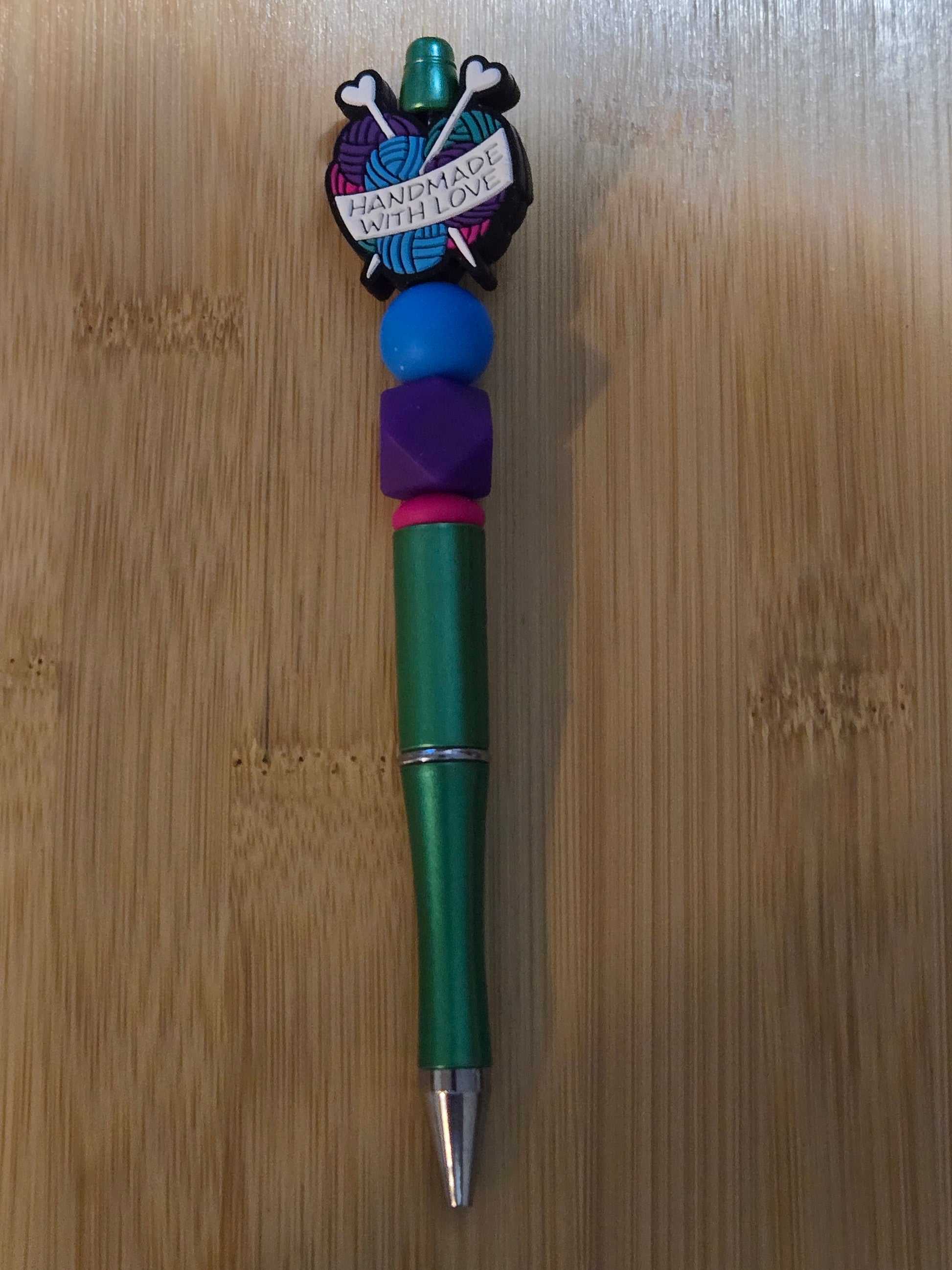 Green pen with pink, blue, and purple beads and "Handmade with Love" focal