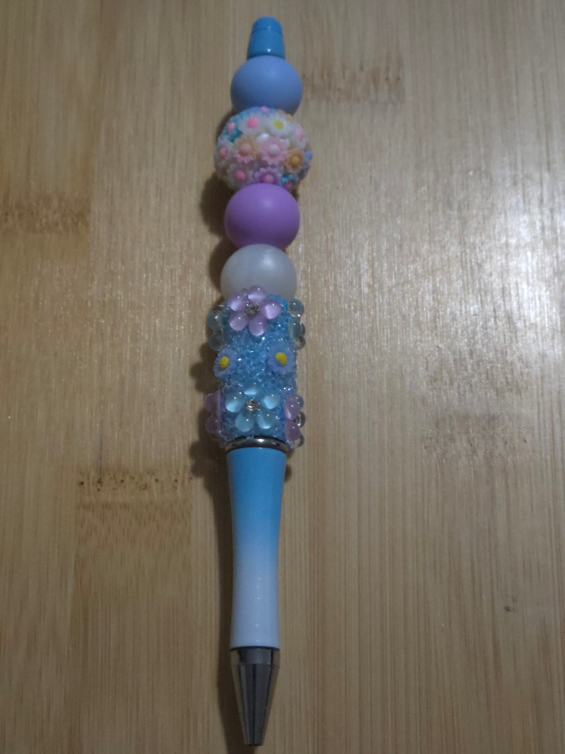 Blue ombre flower pen with blue, white, and purple beads and a flower bead