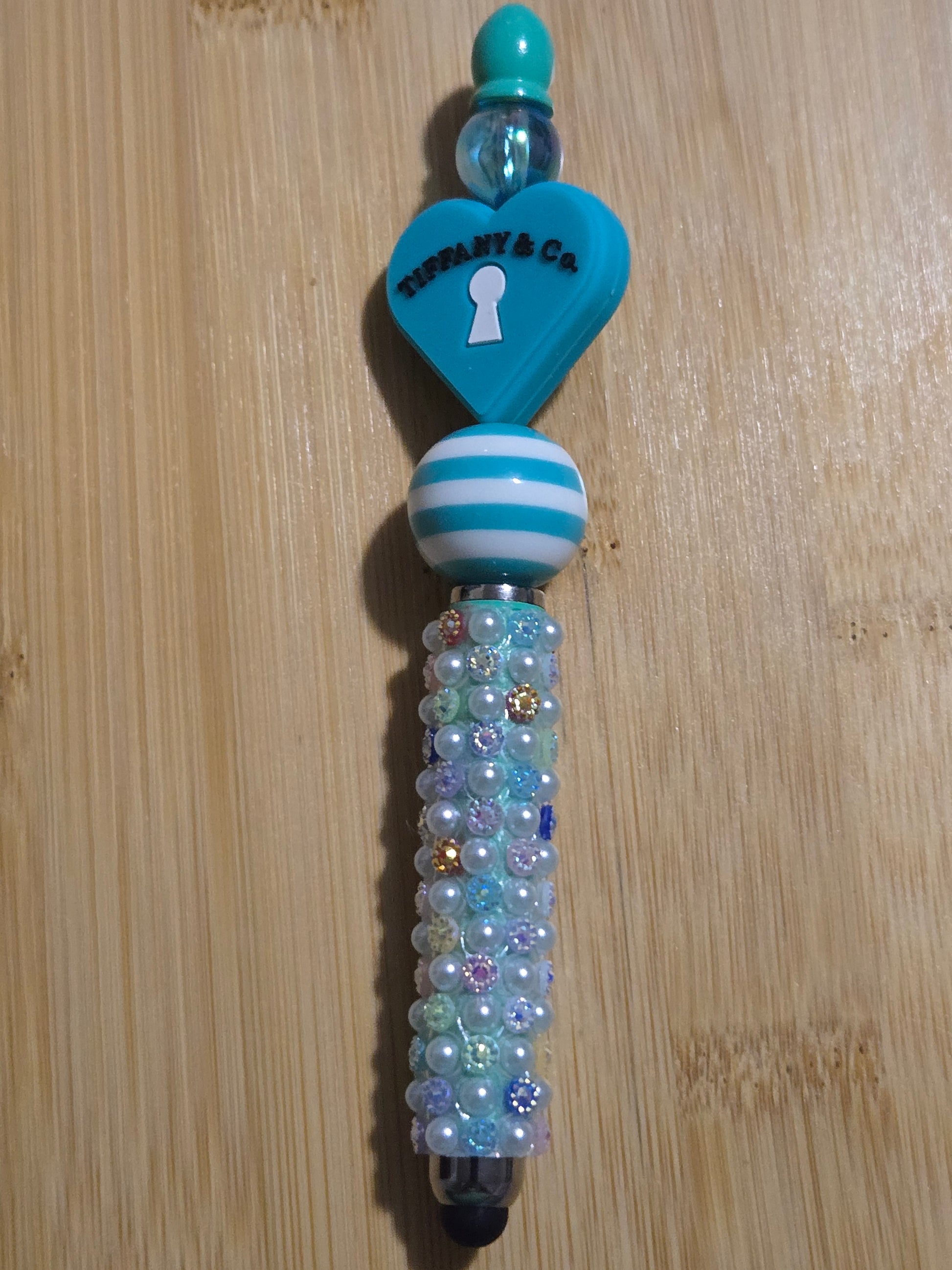 Teal Beaded stylus with teal striped and blue beads and a Tiffany heart focal