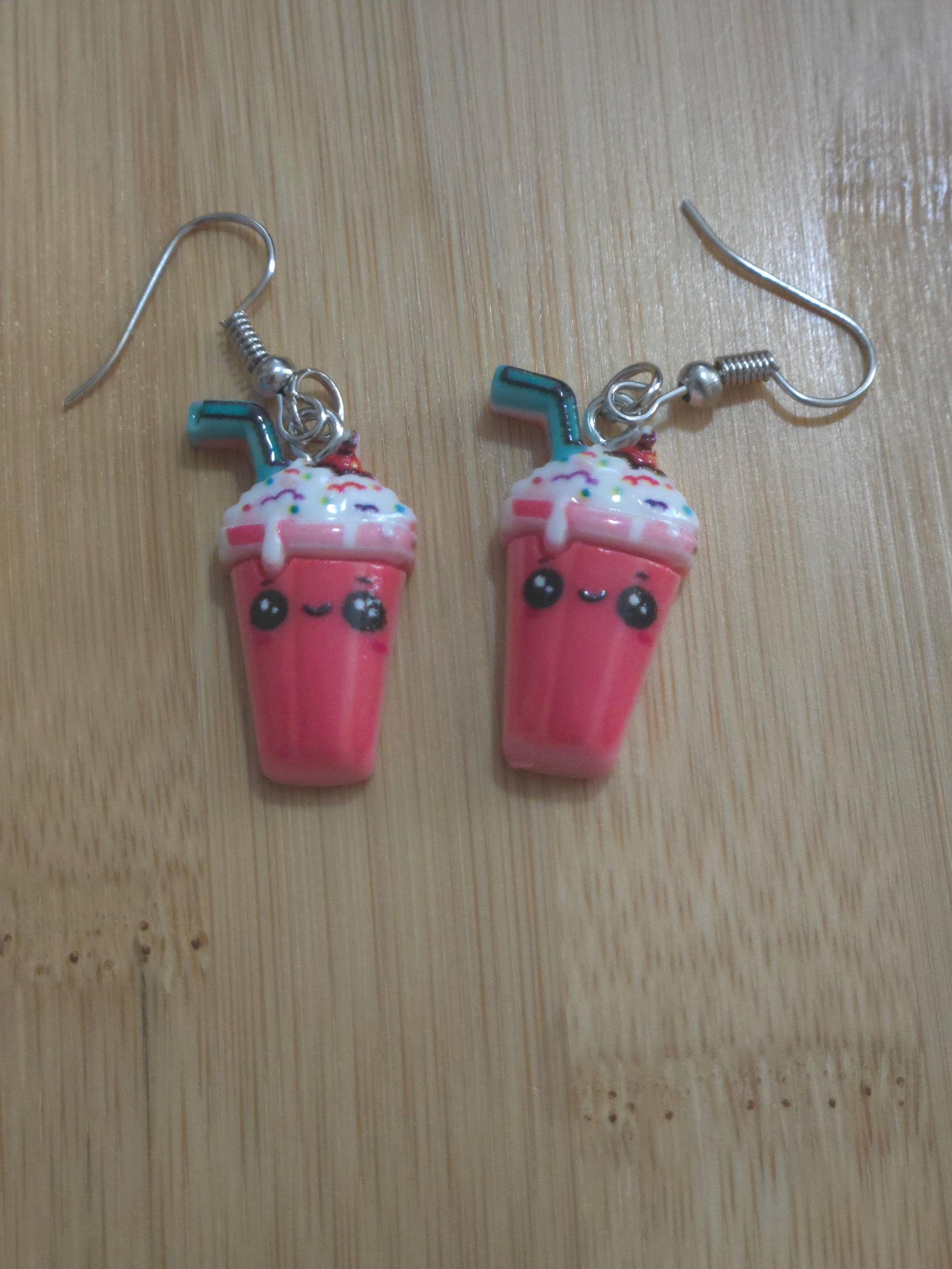 "Shake" up your style with these irresistibly cute Kawaii Milkshake Dangle Earrings! Featuring charming pink milkshake cups with sweet little faces, "whipped cream" tops, colorful sprinkles, and even tiny blue straws, these earrings are pure fun. They're lightweight and dangle perfectly from silver-tone ear hooks, adding a delightful touch of whimsy to any outfit.